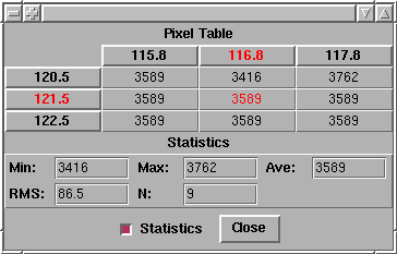 The row and column headings are the X and Y coordinates in the raw image and the table items are the image pixel values at the given coordinates. Note that normally, the origin is at lower left in the raw image. This changes when the image is rotated or flipped. The table is constantly updated when the mouse pointer is moved over the image. See RtdImagePixTable(n) for more details.
