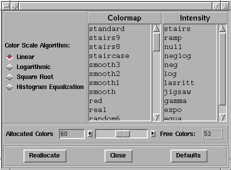 Colors ... pops up a window to set the colormap, intensity, color scaling algorithm and the number of colors allocated.