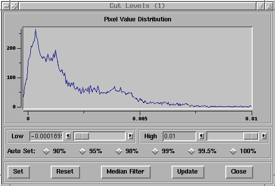 The graph shows a plot of the pixel value distribution in the image and the scales, arrow buttons and entry widgets allow you to manipulate the cut levels and the graph. The Auto Set buttons allow you to set the cut levels by percent of pixels within the cut levels. The Set button sets the cut levels to the selected values. Reset sets the low and high cut levels to the min and max image values resp. Median Filter applies a median filtering algorithm to the image to set the cut levels. Close removes the window again. See the man page RtdImageCut(n) for more details.
