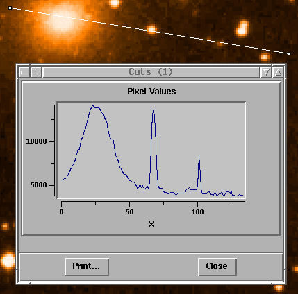 The Cuts... item sets the drawing mode in the canvas to line and changes the cursor to reflect this. After the user drags out a line on the image, a popup window is displayed with a graph of the pixel values along the given line