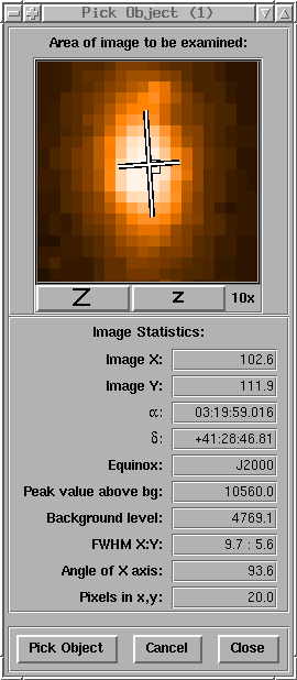The Pick Object... item pops up the Pick Object window, allowing you to select an object in the main image. Once an object is selected, statistics are displayed about the object, including the center coordinates in image pixles and world coordinates (if supported by the image), the object size and rotation, calculated using a FWHM algorithm. The selected object is marked by a blinking cross in the image, which also shows the size and rotation of the object. You can also zoom the small image in and out to get a better view of the object.