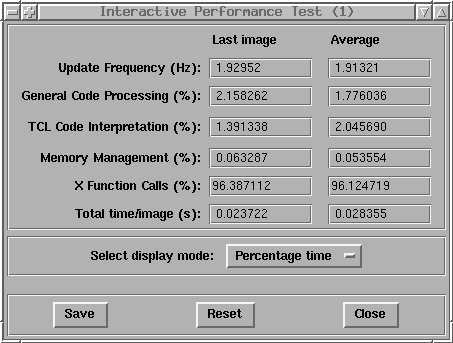 The performance data can be displayed in three ways; as absolute time per image event, as percentage of total time per image event, or as normalised time. In the latter case, the X function calls and memory management processes are divided through by the size of the image (in kB) to allow comparison of performance across platforms for different image types and sizes. The normalised format is not applicable to general processing and Tcl code interpretation.