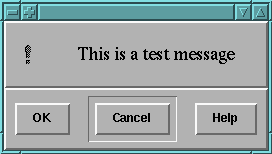 set w [DialogWidget .d \ -text {This is a test message} \ -bitmap warning \ -default 1 \ -buttons {OK Cancel Help}]