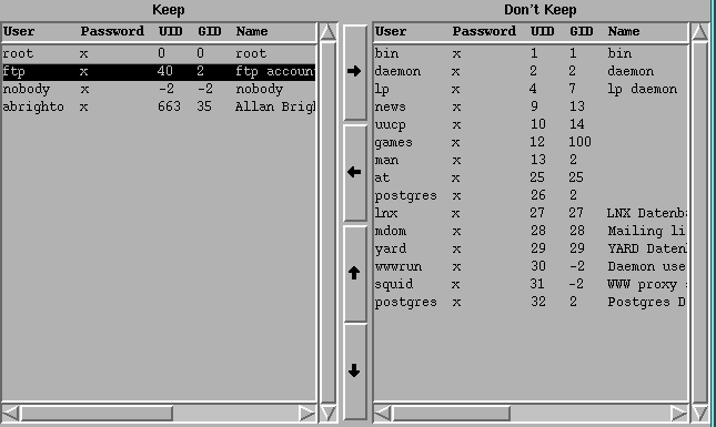 # create the DoubleTableList itk_component add dtlist { DoubleTableList $w_.dtlist \ -lefttitle "Keep" \ -righttitle "Don't Keep" \ -hscroll 1 \ -updown 1 \ -selectmode extended } pack $itk_component(dtlist) -fill both -expand 1 set headings {User Password UID GID Name Home Shell} set info {} set fd [open /etc/passwd] while {[gets $fd buf] != -1} { lappend info [split $buf :] } $itk_component(dtlist) config \ -headings $headings \ -leftinfo $info \ -rightinfo {}