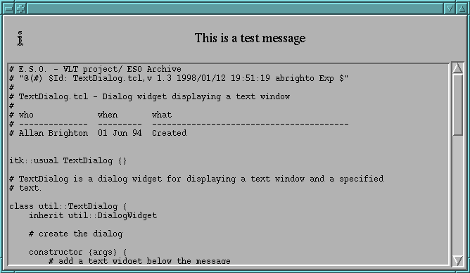 set w [TextDialog .d \ -text $text\ -contents $contents] $w activate